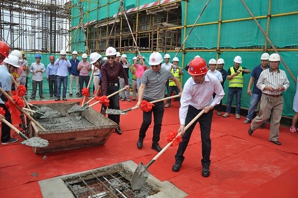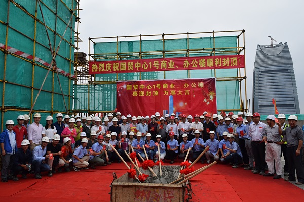 上午10时许,封顶仪式在响亮的鞭炮声和热烈的掌声和欢呼声中正式开始,总承包单位—中建五局广东公司总经理张应文致开幕辞。他表示,自项目开工以来,中建五局集中技术力量,克服高温雨季等各种不利因素的影响,攻坚克难,在监理及各建设单位的全力配合下,从2016年3月份开始,行动迅速,“大干快上”,保持了五天一层的稳定进度,提前57天顺利完成1号楼主体结构的封顶任务。接下来,中建五局将再接再厉,为民盈·国贸中心项目后期建设不懈努力,打造精品工程。
