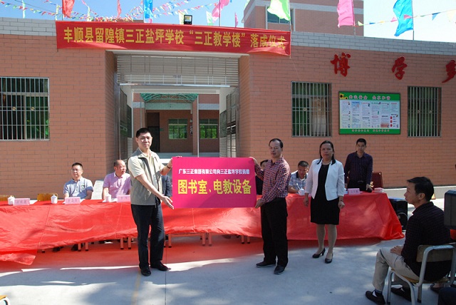 广东三正集团为学校落成带来了精心准备的礼物:一块诠释“三正”精神的牌匾;一套电教设备;一个拥有3500册图书的三正图书室;还有四千多名三正员工的祝福。